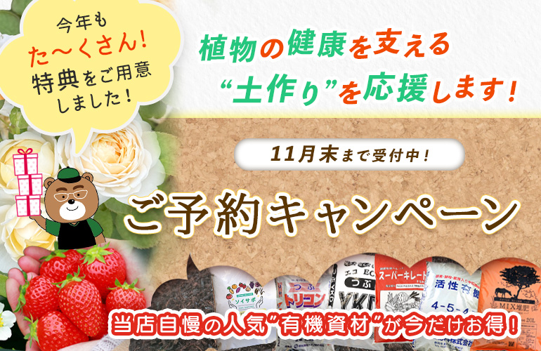 ご予約キャンペーン 更新日:2025年11月2日 公開日:2018年9月28日 早期予約割引として、お得な特別価格で人気商品をご提供致します! キャンペーン期間:11月30日まで! うれしい特典がたくさん! ★ご予約特別価格! ★商品のポイント2倍! ★もれなく当店自慢の資材、土壌改良剤(YKDまた […] 続きを読む