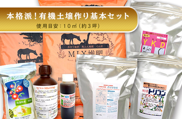 本格派!有機土壌作り基本セット 更新日:2025年12月4日 公開日:2025年2月20日 【土作りセット】 美味しい野菜は土壌から!有機栽培に欠かせない、有機土壌作りをハイレベルで実現できる資材が詰まったセットです。 このセット1つで、およそ10㎡の土作りを行える量になっています。 続きを読む